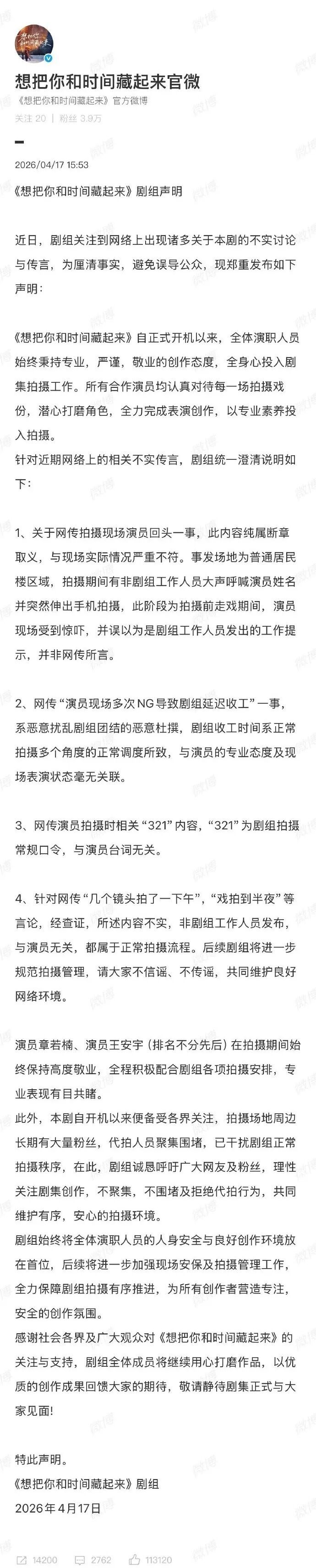 昨天(4月17日)下午,《想把你和时间藏起来》剧方发布声明澄清: